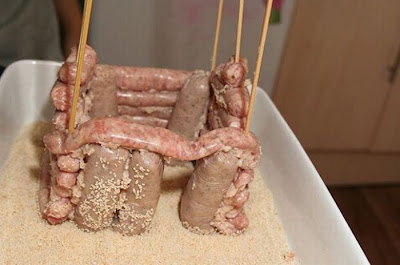 A house made out of sausages and bacon. Sounds delicious and it looks so.